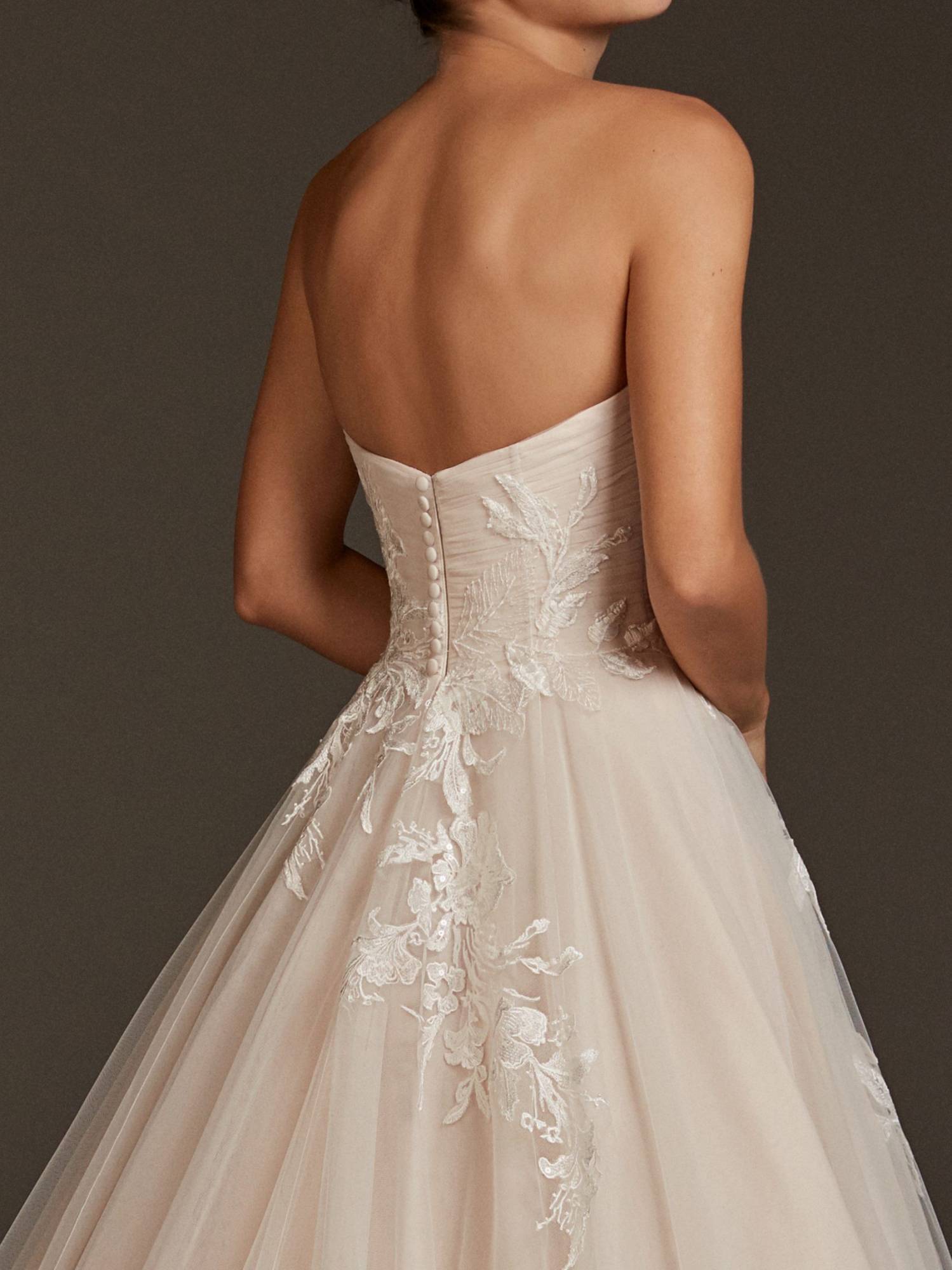 Cette robe de marié princesse nude Pronovias référence Lyra avec sa jupe en tulle orné de dentelles et fleurs brodées, sublimera la silhouette de la future mariée grâce à sa taille ajustée. Son décolleté coeur sensuel mettra en valeur votre poitrine.