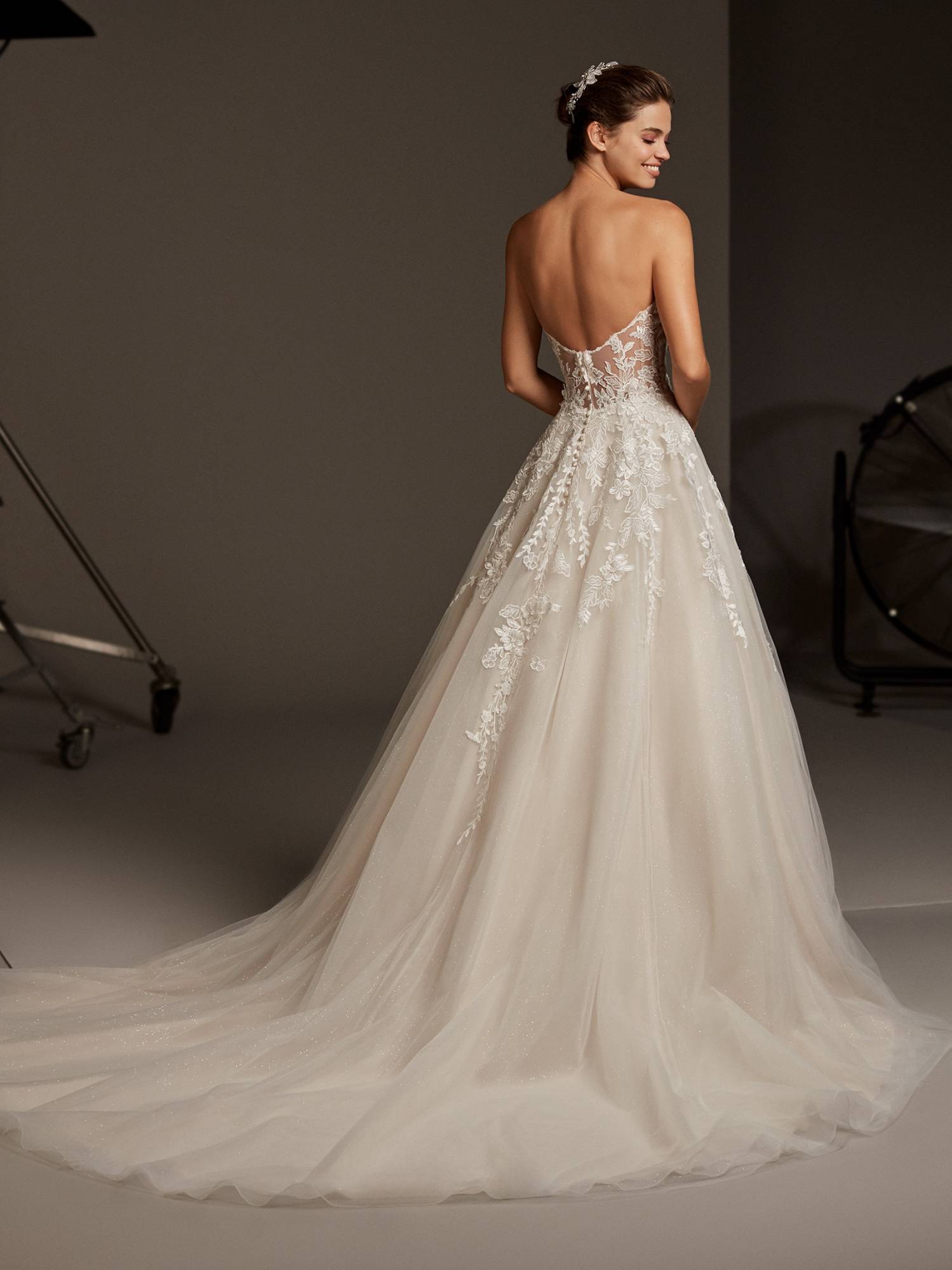 Ce modèle de créateur espagnol s'inscrit dans un style glamour, idéal pour un mariage tendance moderne chic mais moderne qui marque la différence par son coloris nude. Son dos nu plongeant jusqu'au bas du dos soulignera la cambrure de la mariée.